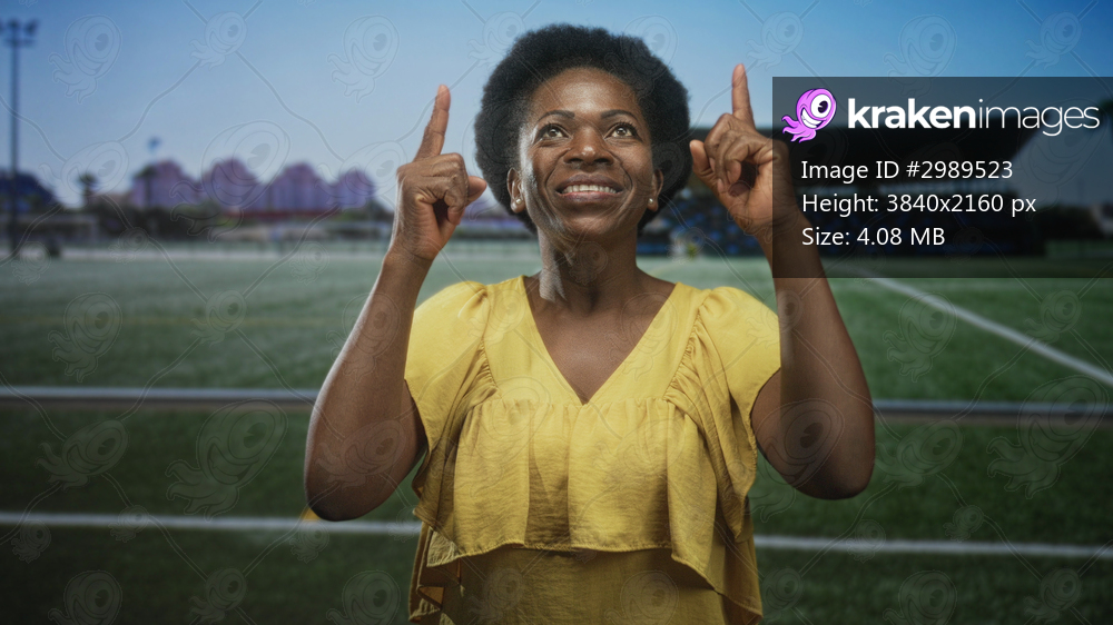 Woman pointing both index fingers upward on a soccer stadium field in front of a building; joy hope celebration.