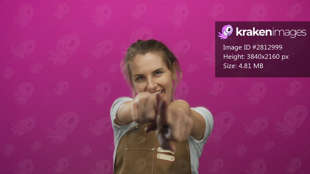 Woman pointing cheerfully in brown apron against vibrant pink background.