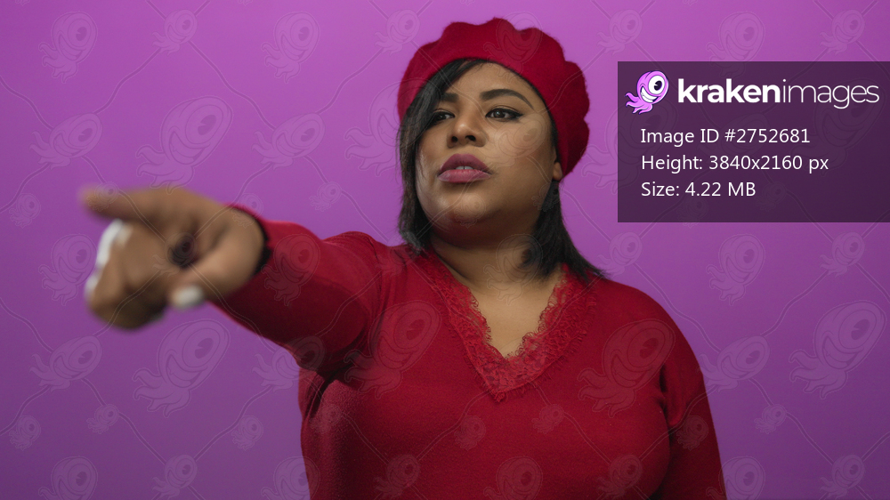 Woman pointing confidently against vibrant purple background wearing red, capturing a bold and assertive moment with strong color contrast and focus on gesture and presence. - Kraken Images