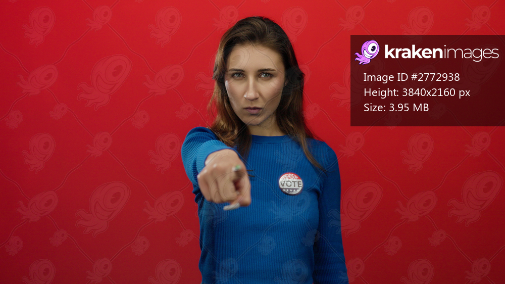 Woman pointing with determination wearing vote badge against red background emphasizing civic duty in the united states election.