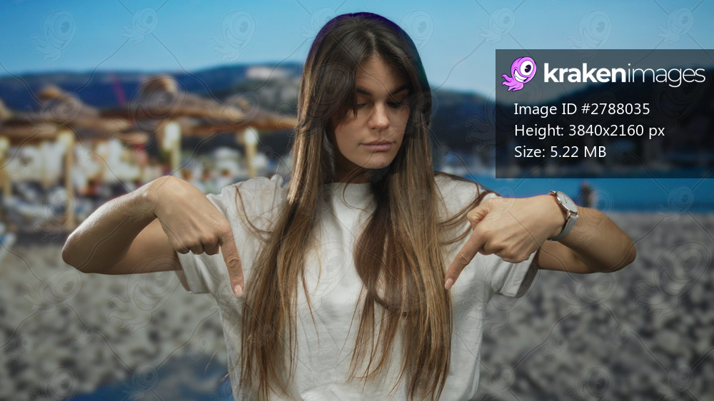 Woman pointing down at sunny beach with sea and mountains in background, wearing casual white shirt, showcasing outdoor summer lifestyle.