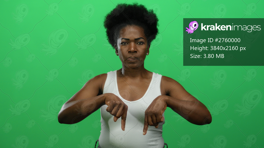 Woman pointing down in front of a vibrant green background wearing a white tank top, expressing focus and confidence in her gesture over the isolated setting. - Kraken Images