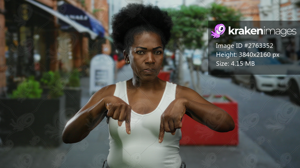 Woman pointing downwards on a lively city street with buildings and trees in the background, wearing a white tank top and standing confidently.