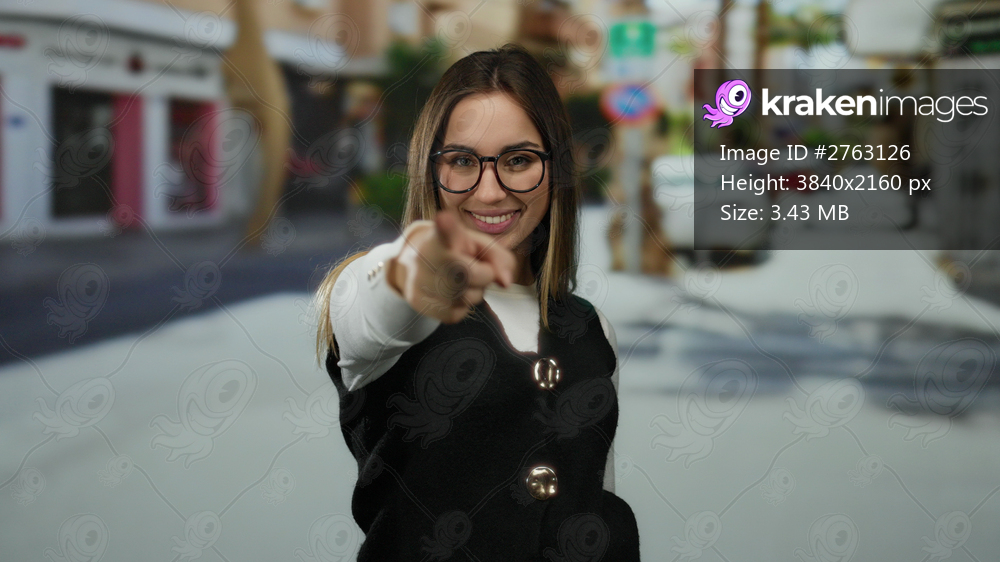 Woman pointing energetically with finger in a vibrant outdoor street setting wearing glasses and black vest, exuding confidence and positivity in the urban scene. - Kraken Images