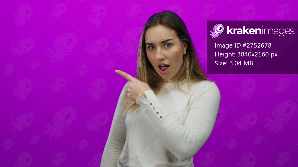 Woman pointing enthusiastically against vivid pink background, showcasing excitement, expression, and positivity in an isolated setting