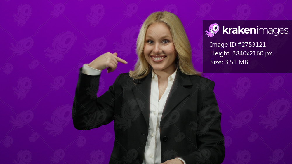 Woman pointing with excitement against a vibrant purple background wearing a formal black suit and white shirt, showcasing energetic, confident expression with blonde hair - Kraken Images