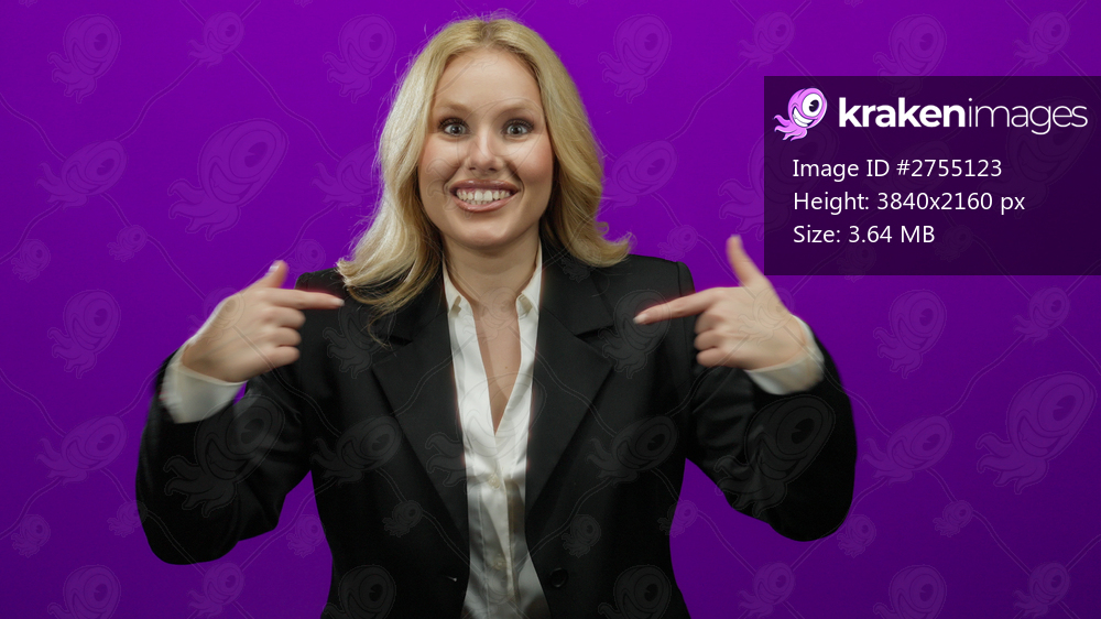 Woman pointing with excitement against a vibrant purple background wearing a formal black suit and white shirt, showcasing energetic, confident expression with blonde hair - Kraken Images