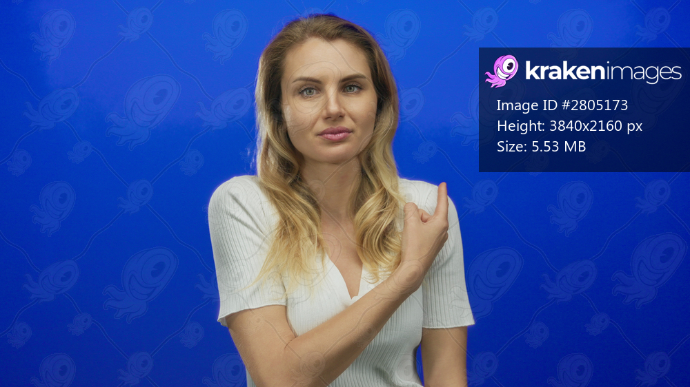 Woman pointing with expression against blue background wearing white top portraying emotion suggesting concept direction or choice