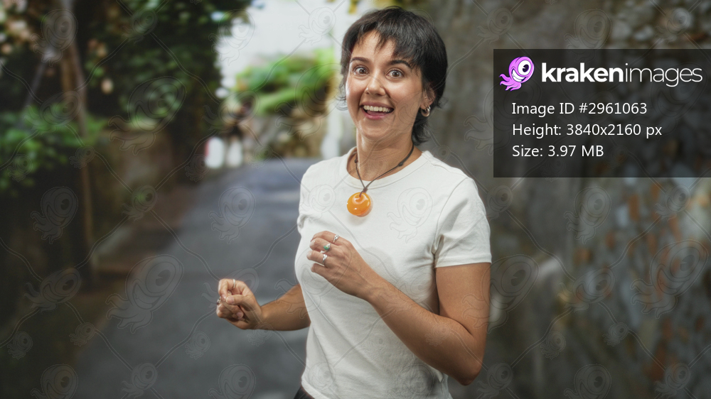 Woman pointing finger and arm upward on a narrow stone street, wearing white tee and orange pendant; joyful curiosity.