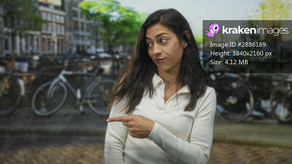 Woman pointing finger at a bicycle rack on street in amsterdam, candid outdoor scene with visible bare hand, white shirt and subtle frown; skepticism.