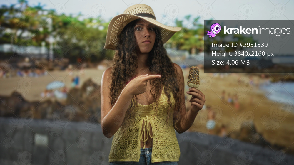 Woman pointing finger at a popsicle while holding it near her chest on a street promenade by a sandy beach with palm trees; curiosity.