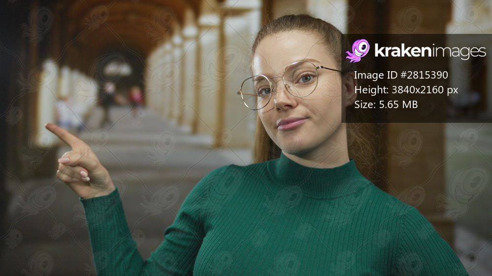 Woman pointing finger at arched sunlit stone facade of historic building in old town street; direction.