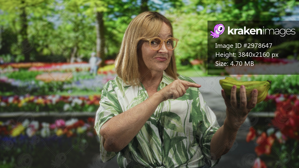 Woman pointing finger at bananas held in her hand on a studio set with garden props; playful curiosity.