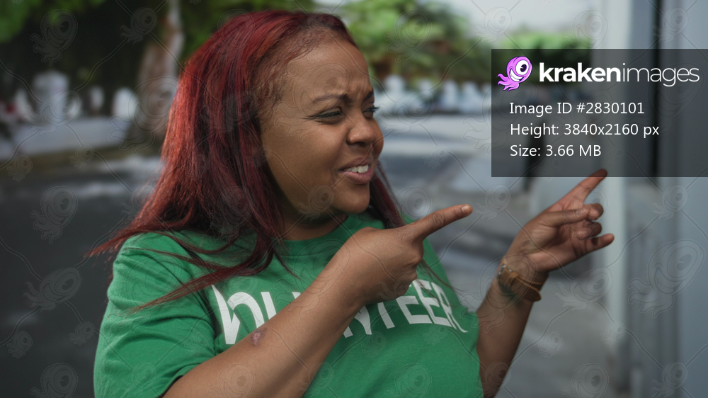 Woman pointing finger at building door on city street wearing green volunteer t shirt and red hair with parted lips and raised eyebrows; surprise.