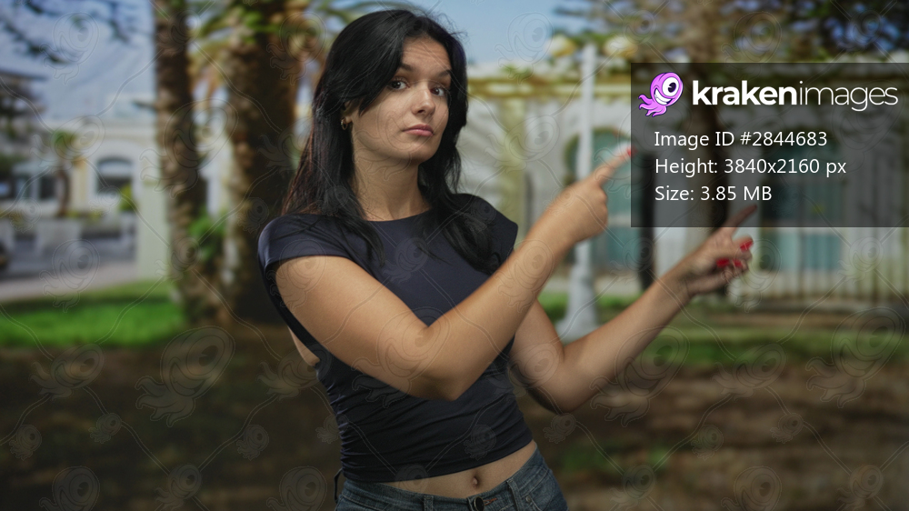 Woman pointing finger at building facade amid sunlit palm trees in a green lawn under clear sky; doubt.