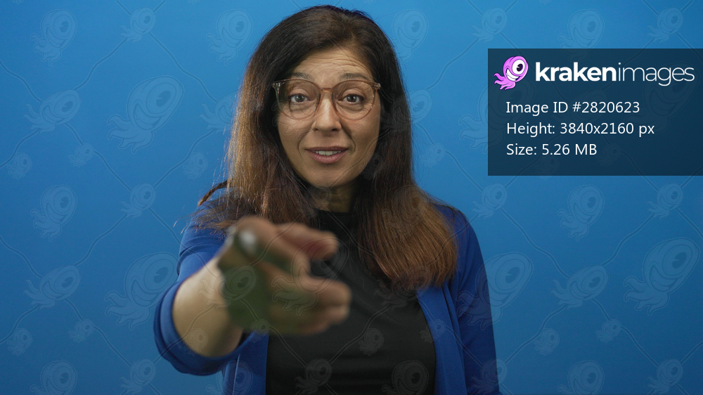 Woman pointing finger at camera in a blue studio setting with eyeglasses and long hair visible; engagement.