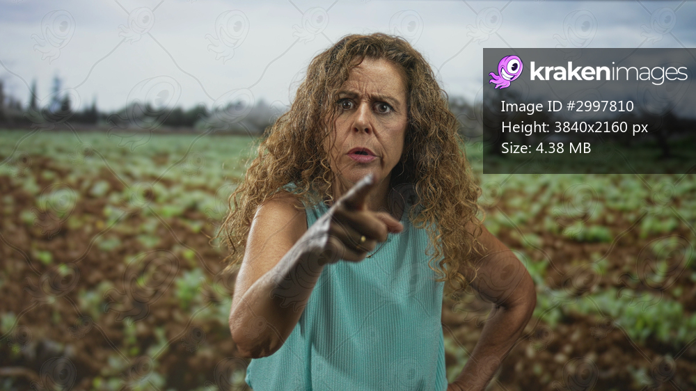 Woman pointing finger at camera in a farm field wearing turquoise sleeveless top and gold necklace, stern frown and visible wrinkles; accusation.