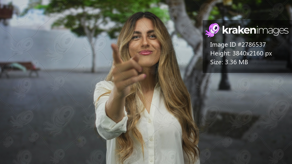 Woman pointing finger at camera in plaza; invitation welcome.