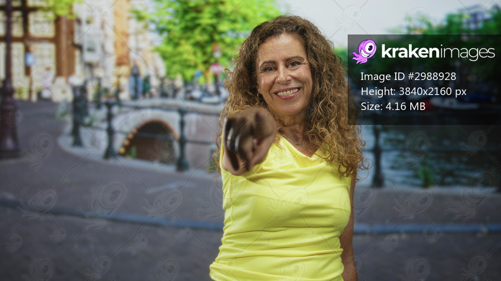 Woman pointing finger at camera on a canal street wearing a yellow sleeveless top and smiling; confidence invitation.