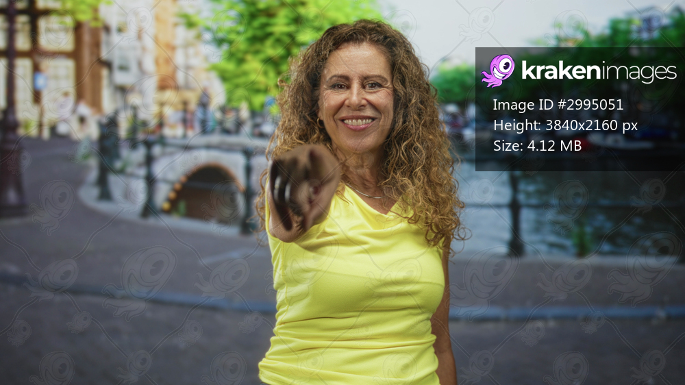 Woman pointing finger at camera on a canal street wearing a yellow sleeveless top and smiling; confidence invitation.