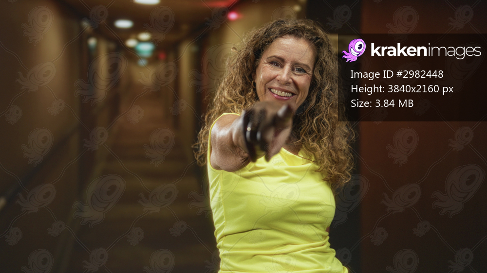 Woman pointing finger at camera with outstretched hand in a hotel building corridor wearing yellow sleeveless top; confidence.
