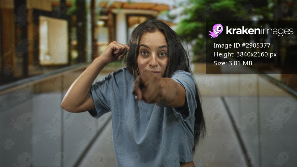 Woman pointing finger at camera and pressing finger to temple in a modern glass building; anger defiance.