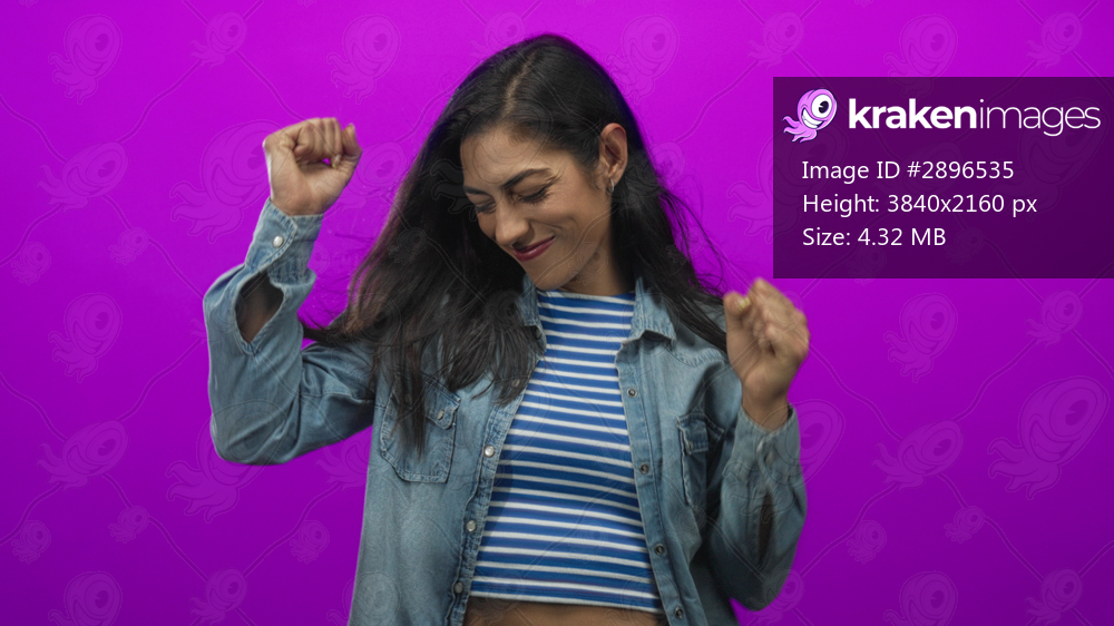 Woman pointing finger at camera showing hand and striped midriff in studio with purple backdrop; invitation confidence.