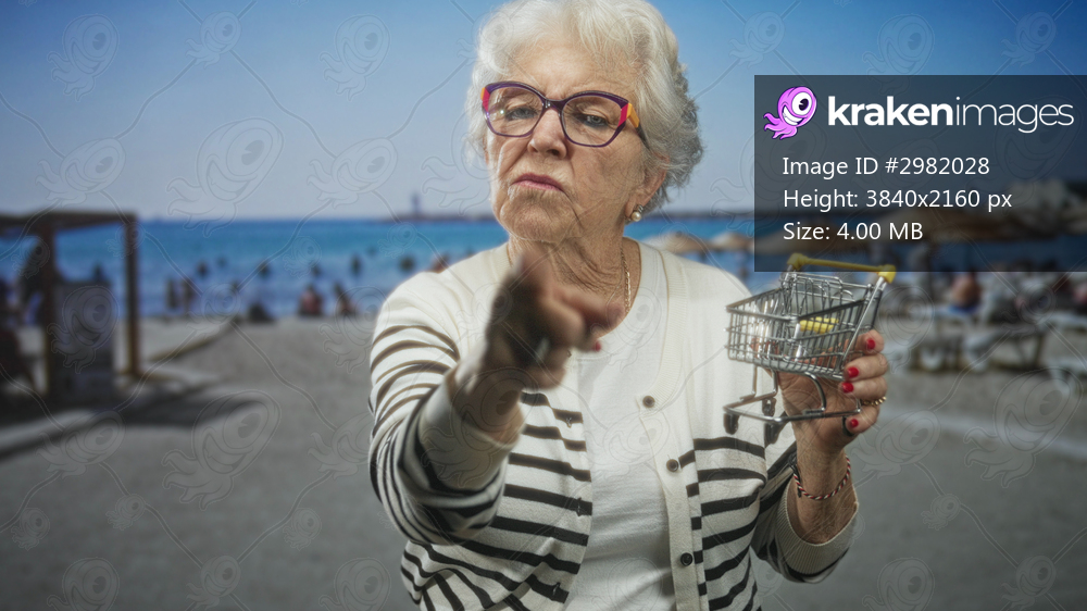 Woman pointing finger at camera while holding a small shopping cart on a sunny beach with umbrellas and loungers visible; disapproval, authority.