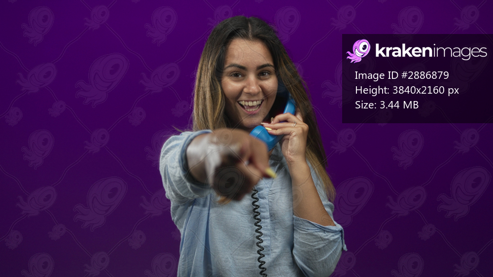 Woman pointing finger at camera while holding blue telephone handset in purple studio; playful invitation.