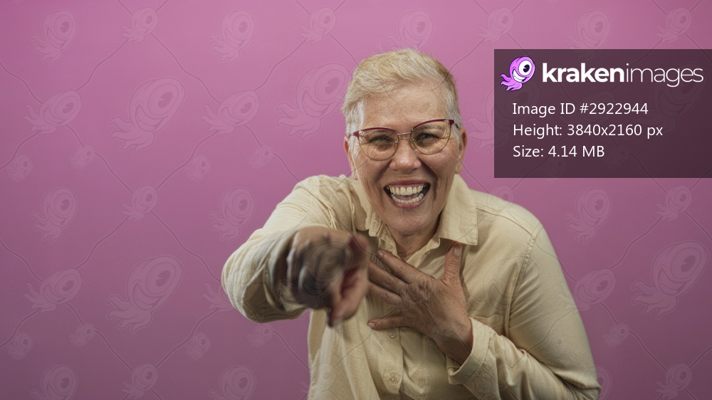 Woman pointing finger at camera while laughing with hand on chest in pink studio wearing beige shirt and glasses; playful joy.