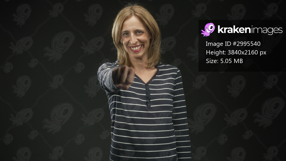 Woman pointing finger at camera while smiling and tapping her chest, then extending arm in studio wearing a striped shirt; friendly invitation.