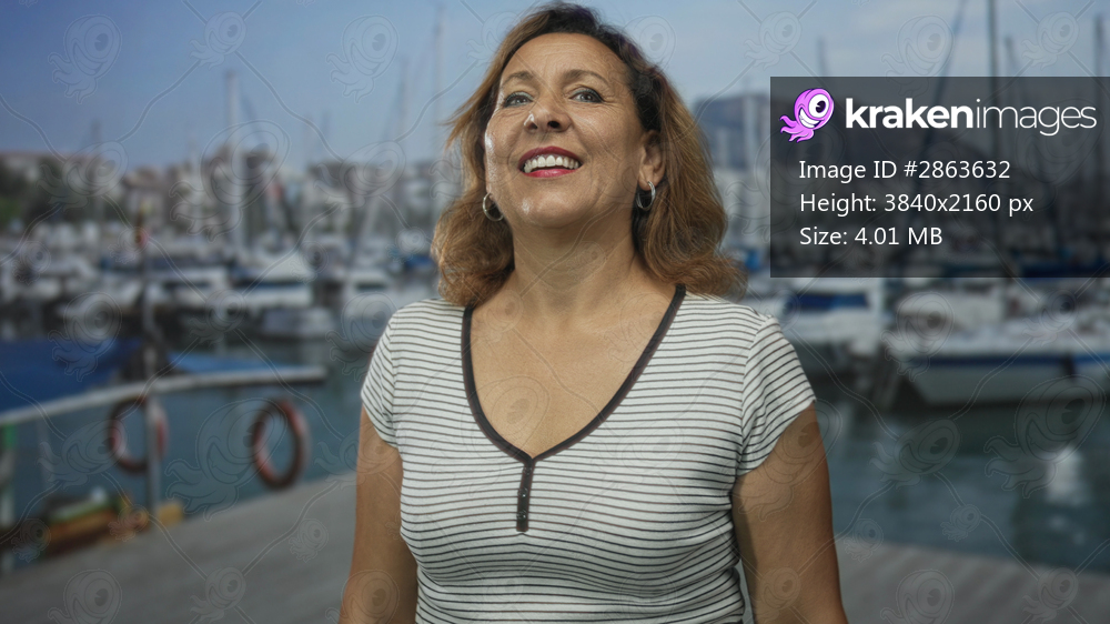 Woman pointing finger at camera while standing on boat deck at port with yachts moored nearby; confidence.