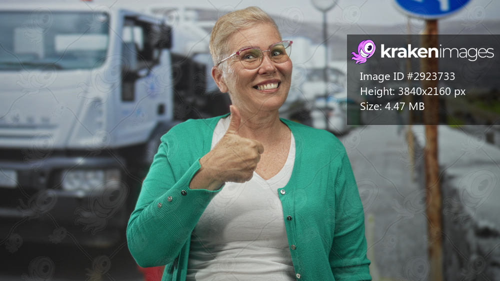 Woman pointing finger at delivery truck and giving thumbs up on street beside parked trucks and a signpost; approval encouragement.