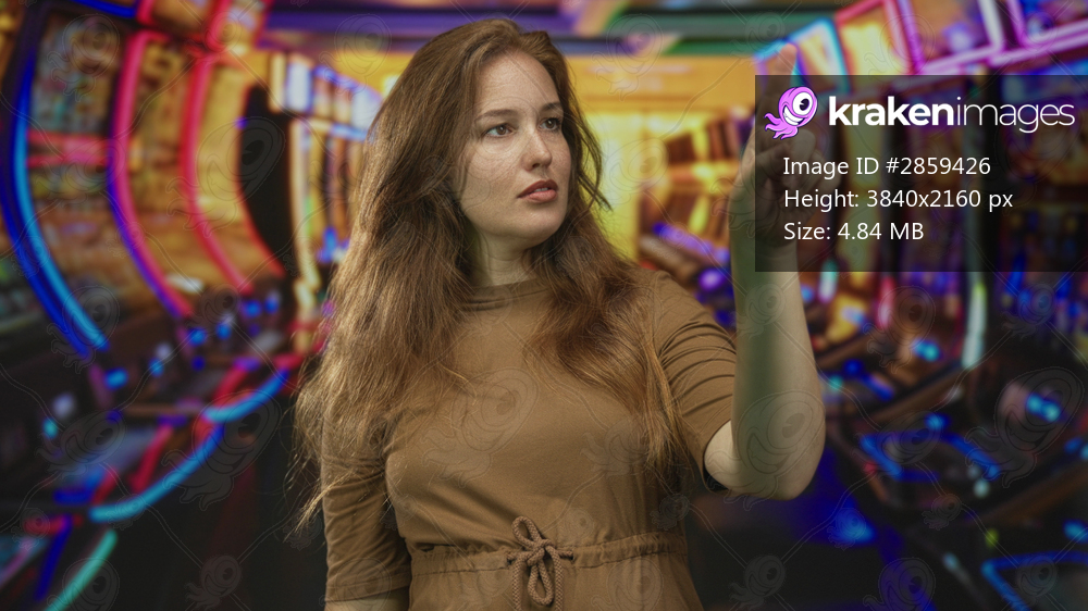 Woman pointing finger at glowing slot machine console in neon lit casino building while selecting virtual jackpot options; risk anticipation.