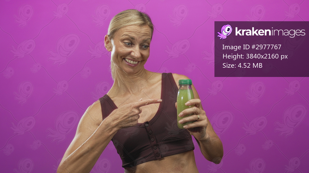 Woman pointing finger at green juice bottle showing hand and torso in studio; wellness confidence vitality.