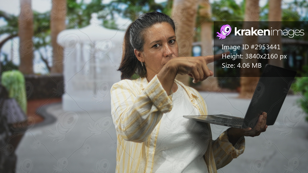 Woman pointing finger at laptop screen while holding laptop with one hand in a building courtyard beside fountain and palm trees; concentration.