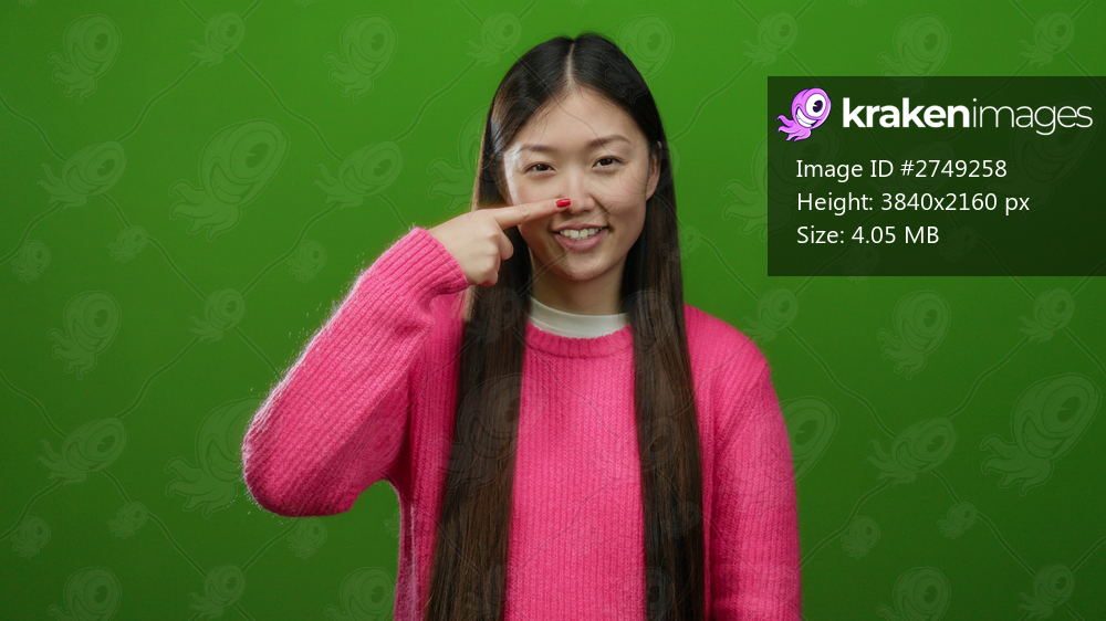 Woman pointing finger at nose while smiling in front of vibrant green background wearing bright pink sweater joyful expression captures attention friendly atmosphere - Kraken Images