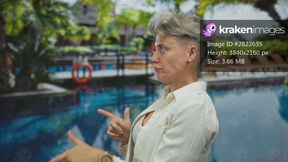 Woman pointing finger at resort pool edge with wooden watch and palm trees around and lounge chairs; playfulness.
