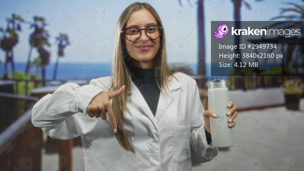 Woman pointing finger at reusable bottle on beach boardwalk in lab coat and glasses; playful confidence.