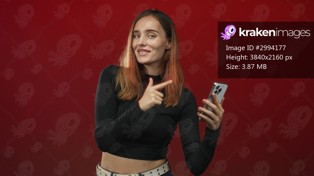 Woman pointing finger at smartphone in studio while smiling and holding the phone with one hand; playful confidence.
