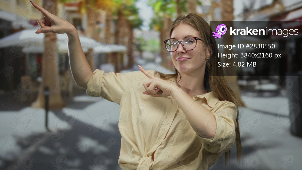 Woman pointing finger at urban street café scene with raised arm gesture showcasing glasses and casual style; confidence.