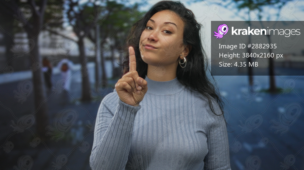 Woman pointing finger at viewer with hand under chin, wearing blue sweater and hoop earrings on a tree lined city street; confidence.