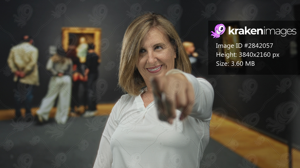 Woman pointing finger at viewer in art gallery building among framed paintings lining the walls; joy.