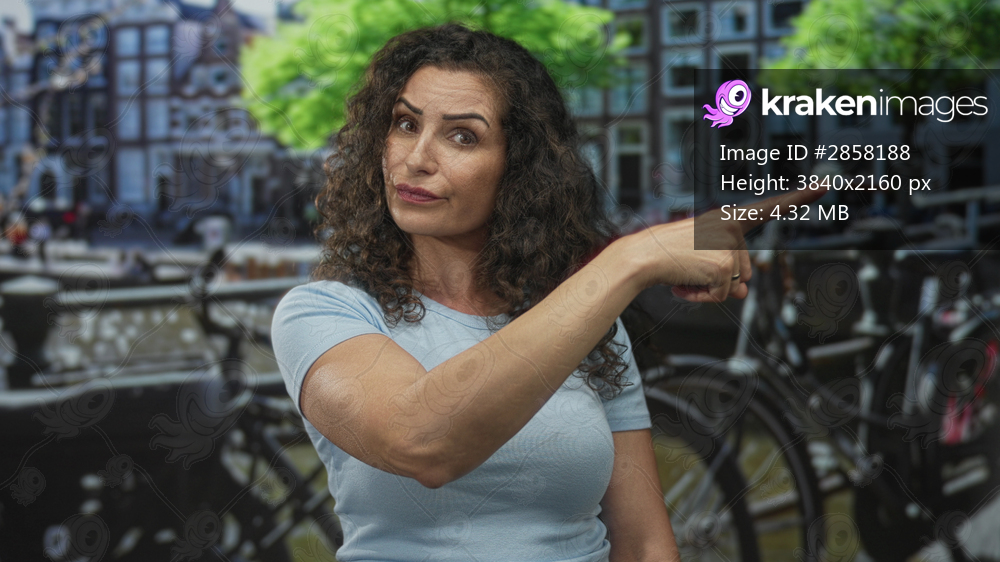 Woman pointing finger beside a canal lined with bicycles on a city street; assertion authority confidence.