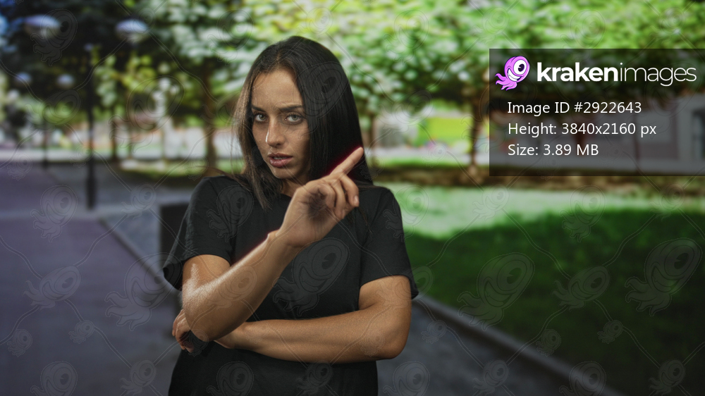 Woman pointing finger with crossed arms and stern gaze in street park beside trees and lamppost; warning authority.