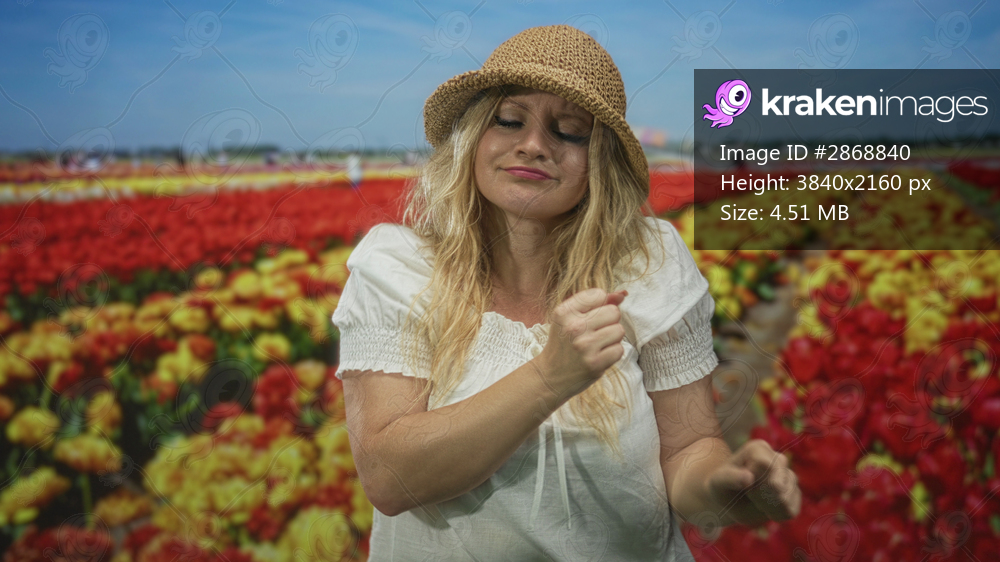 Woman pointing finger and dancing in a colorful tulip field wearing straw hat and white blouse; playful summer escape.
