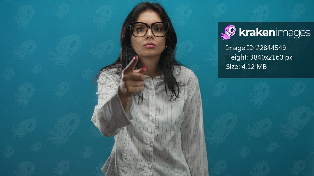 Woman pointing finger directly at camera in blue studio with big glasses and striped shirt; determination.