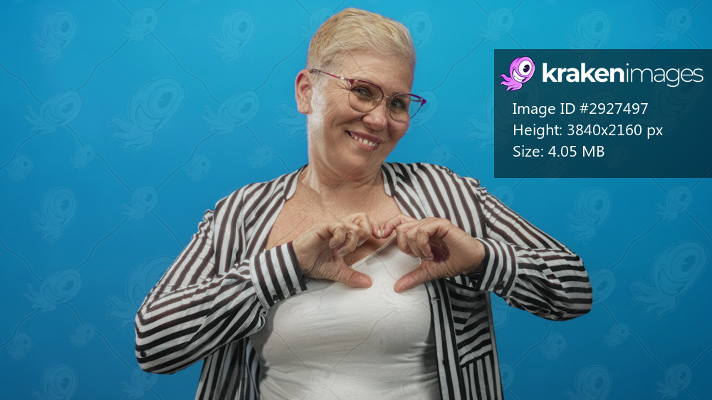 Woman pointing finger and forming a heart with hands in studio with bright blue backdrop; playful affection.
