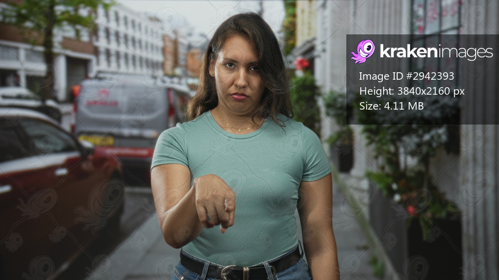 Woman pointing finger forward on a city street beside parked cars and a delivery van, wearing a teal t shirt and jeans; anger accusation confrontation. - Kraken Images