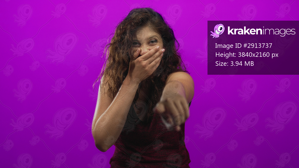 Woman pointing finger and hand covering mouth in magenta studio with grin and direct gaze, young hispanic subject in a sleeveless maroon tanktop; playful reaction. - Kraken Images